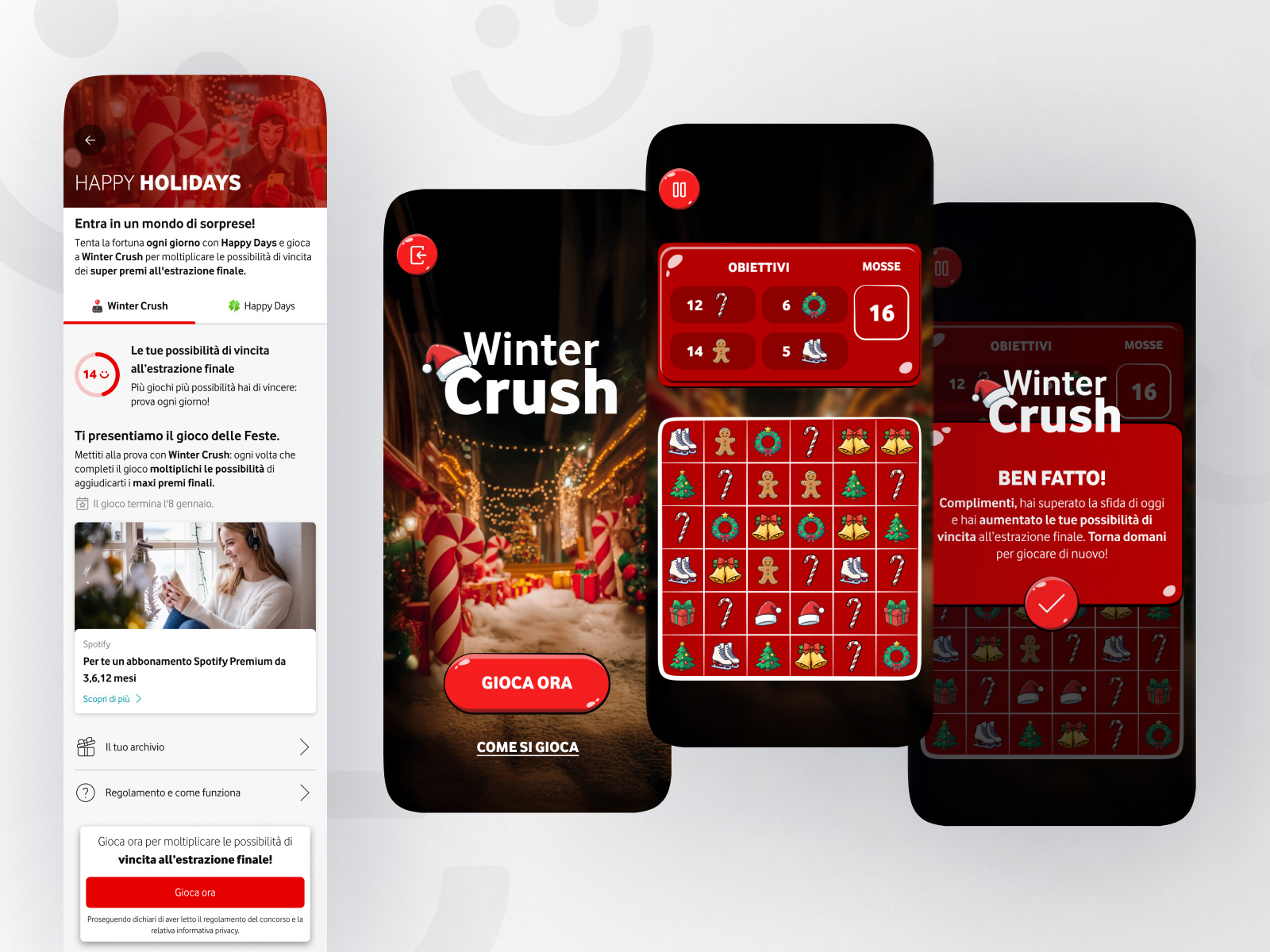 For Christmas 2025, Vodafone Happy launched the special initiative Happy Holidays, a container for two activities: the instant-win lottery Happy Days (already introduced a few months earlier alongside the new Happy) and Winter Crush, a festive mini‑game that allowed users to increase their chances of winning a grand final prize.